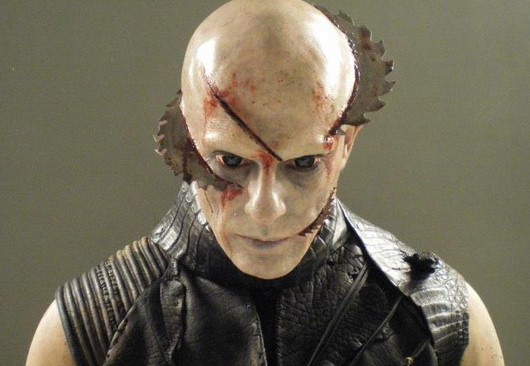A humanoid figure with white, pale skin and pitch black eyes wearing black leather clothing, similar to a bondage outfit and has circular saw blades embedded in his head. He possess telekinetic powers and has the ability to summon lengths of chain to ensnare and rend his victims into pieces.