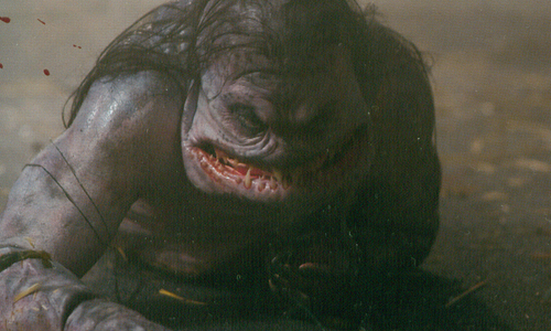 A half-human, half-fish monster with flabby blue skin, a large mouth full of sharp teeth, long unkempt black hair, and a blowhole on its back. It kills by attacking the victim with its teeth and blowing their blood out of its blowhole.